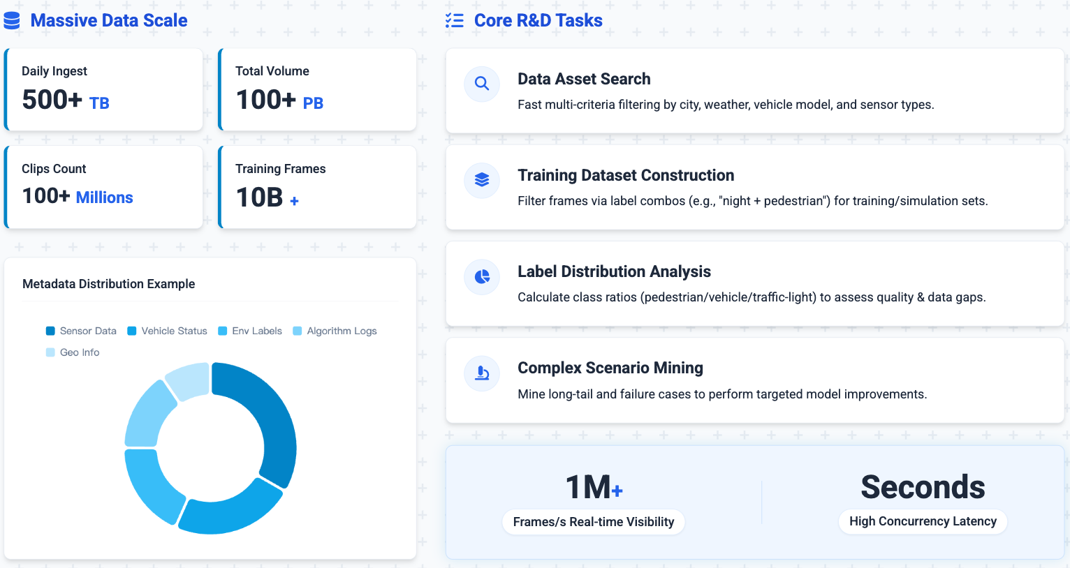 In autonomous driving, the core data platform challenge is building a unified system that can process text, vectors, labels, and metadata simultaneously while supporting efficient retrieval and analysis at a massive scale. Moving from a fragmented architecture to a converged one does not just improve query performance and developer productivity; it creates the foundation for more intelligent, data-driven R&D workflows.