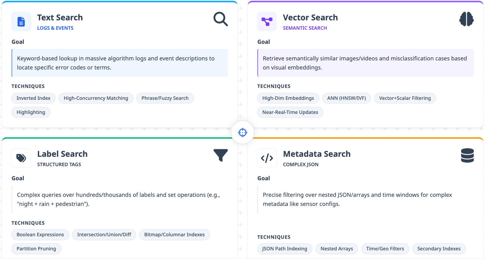 What makes autonomous driving data uniquely challenging is the sheer variety of data types that all need to be searchable: images, point clouds, video, labels, logs, and structured or semi-structured metadata. Nearly every data task boils down to search, and those search requirements fall into four categories.