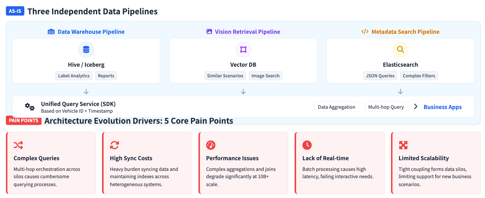 A query service layer sat above all three, but real workflows still required engineers to hop between systems. A typical task might start with filtering data assets in the metadata system, then analyzing label distributions in the data warehouse, then searching for similar scenarios in the vector database. This multi-system serial process was slow and complex. Data synchronization across three platforms drove up operational costs, and any schema change required coordinated updates everywhere. As data grew into the hundreds of billions of records, all three systems faced growing pressure on query performance and scalability.