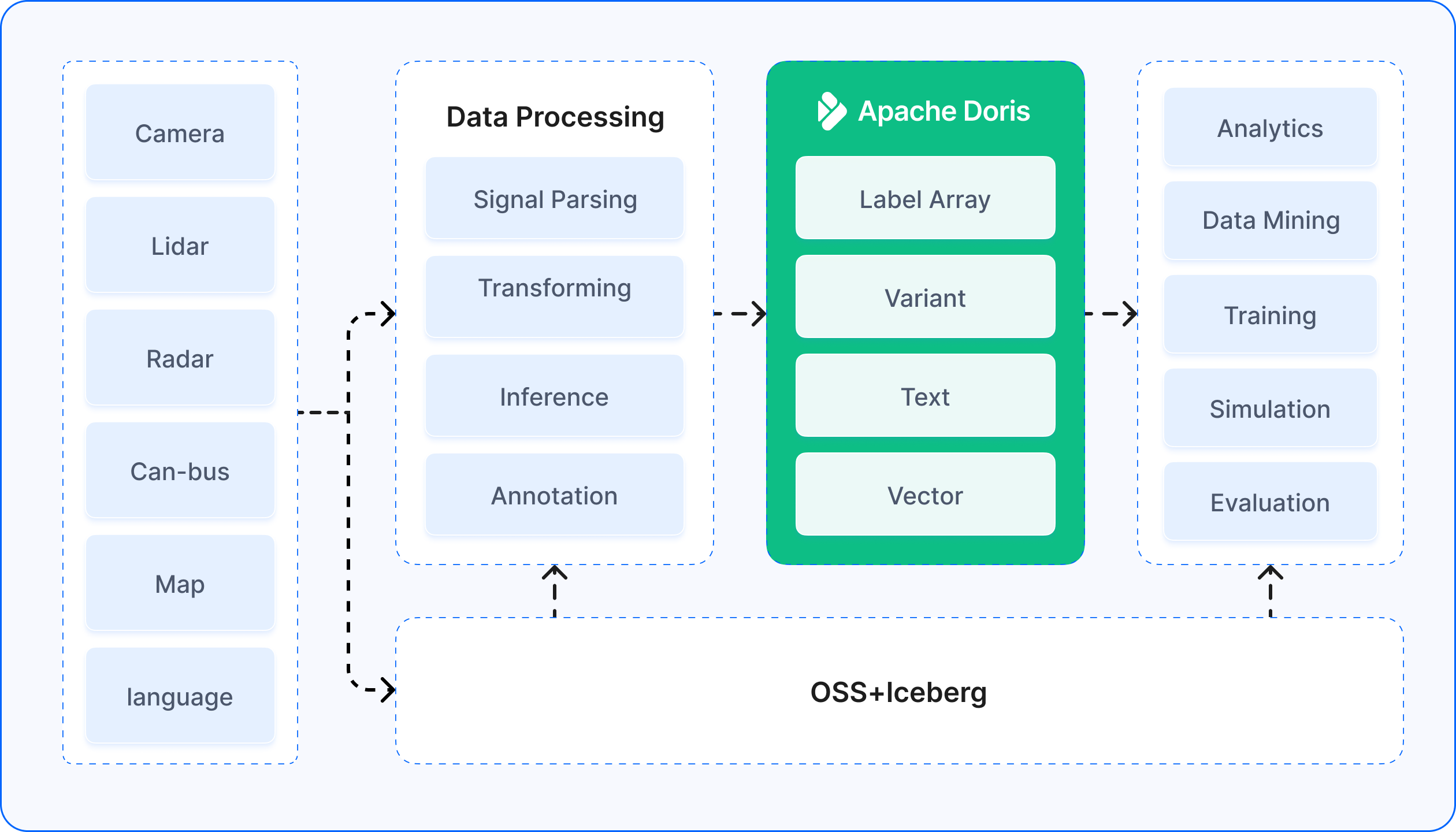 A metadata retrieval pipeline. Vehicle status, event records, and other metadata lived in Elasticsearch, leveraging its JSON search capabilities. But ES struggled with complex aggregations at massive scale and could not perform unified analysis with the label store.