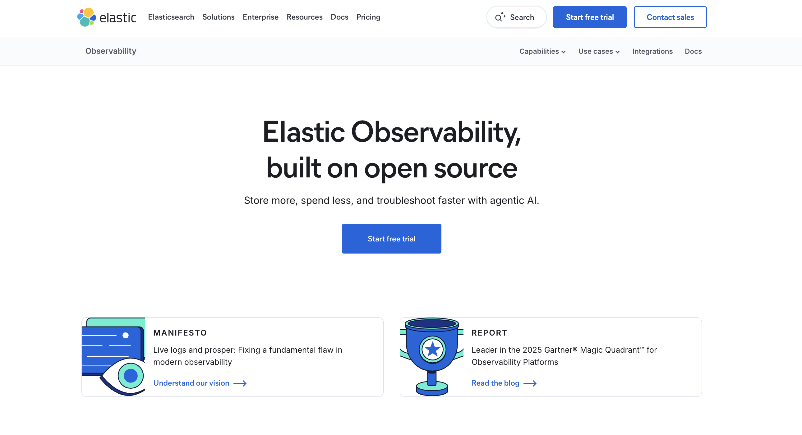 Elastic Observability is built on the Elastic Stack and remains one of the most mature solutions for log-centric observability. Its biggest advantage is search: Elastic is extremely strong at quickly narrowing down logs, correlating events, and supporting investigative workflows. In many organizations, Elastic sits at the intersection of observability and security, because the same log data often powers both incident response and threat detection. Elastic supports metrics and traces as well, but its strongest differentiation is still search-driven log investigation at scale.