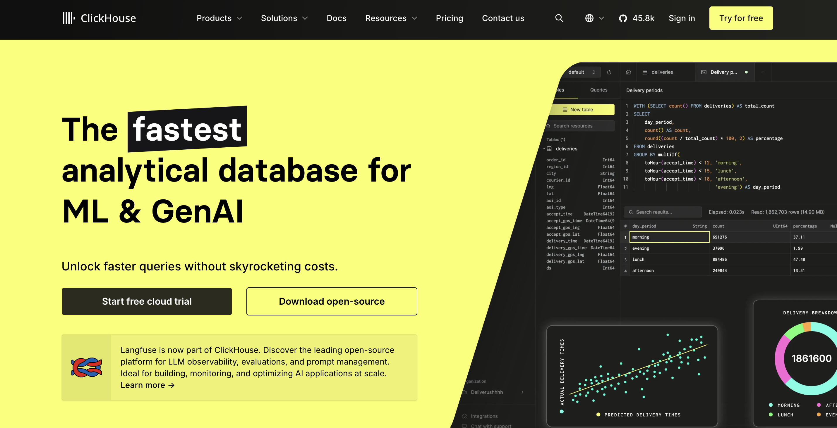 ClickHouse is an open-source columnar OLAP database best known for its raw analytical performance. It’s often the first choice when teams need to scan and aggregate massive volumes of event data—logs, metrics, clickstreams—at very low cost and with impressive speed. In many organizations, ClickHouse starts as an internal analytics engine used by engineers and data teams for exploration and troubleshooting.