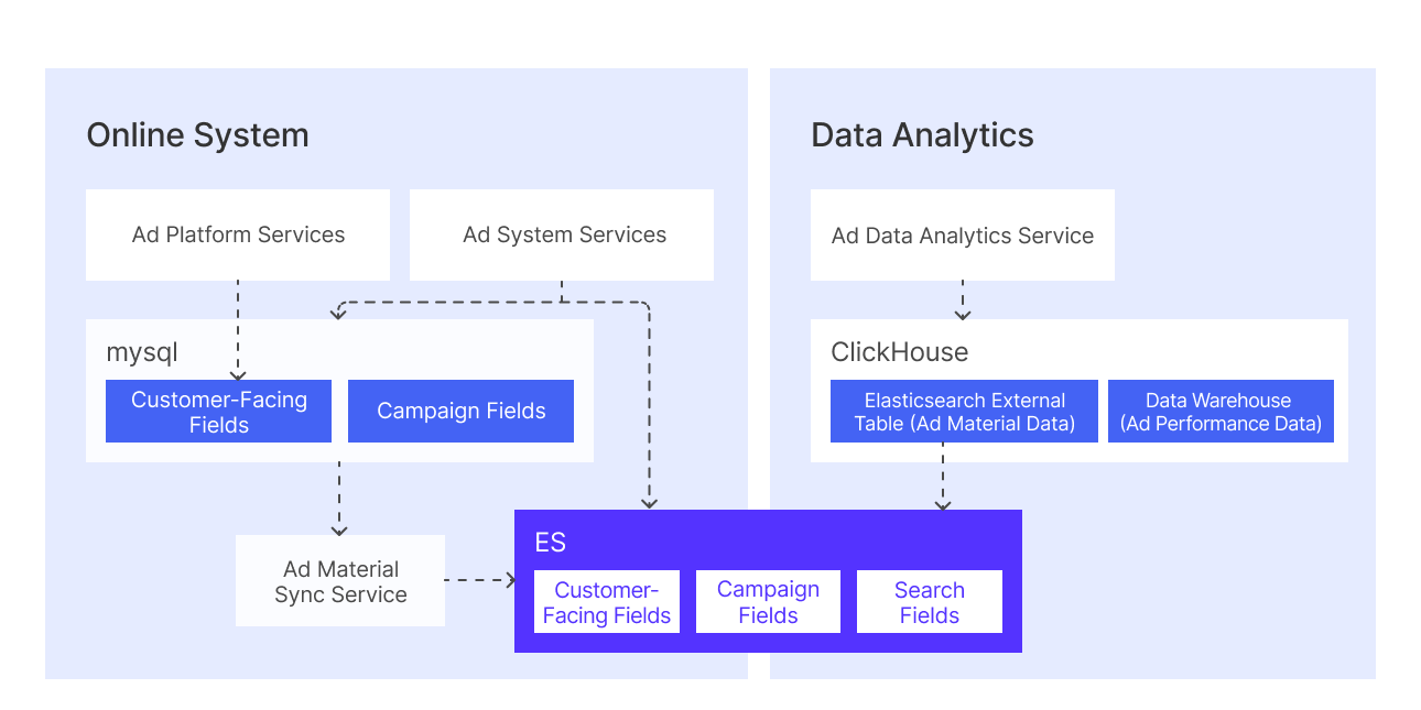 Before migrating to Apache Doris, Kwai stored ad material data across MySQL and Elasticsearch, while ad performance data (impressions, clicks, costs) resided in ClickHouse.