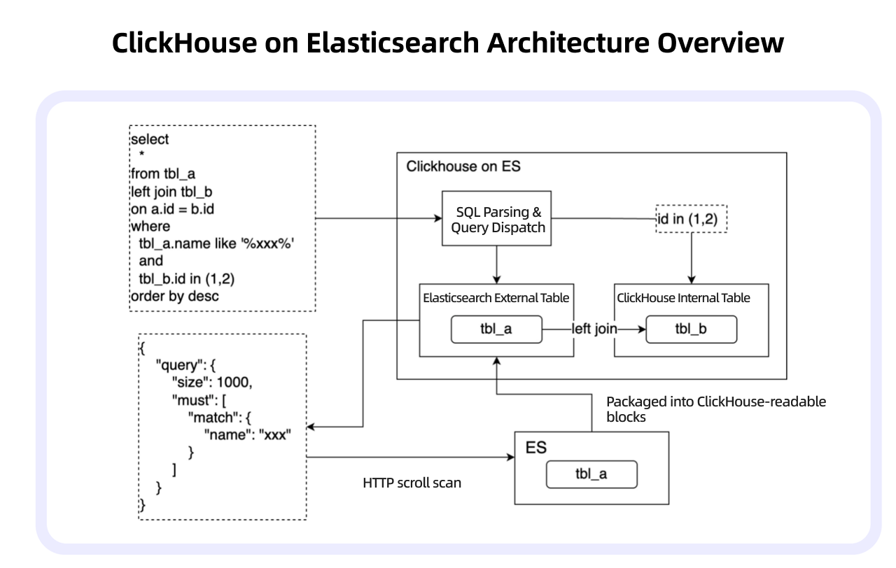Under this architecture, generating ad performance reports required the system to join material data from Elasticsearch with performance data from ClickHouse. A typical user query referenced both an Elasticsearch external table (for material data) and a ClickHouse internal table (for performance data). ClickHouse handled the join by parsing the external table portion of the query, translating it into an Elasticsearch query, fetching the results via HTTP, converting them into internal data blocks, and then performing the join computation against the internal table.