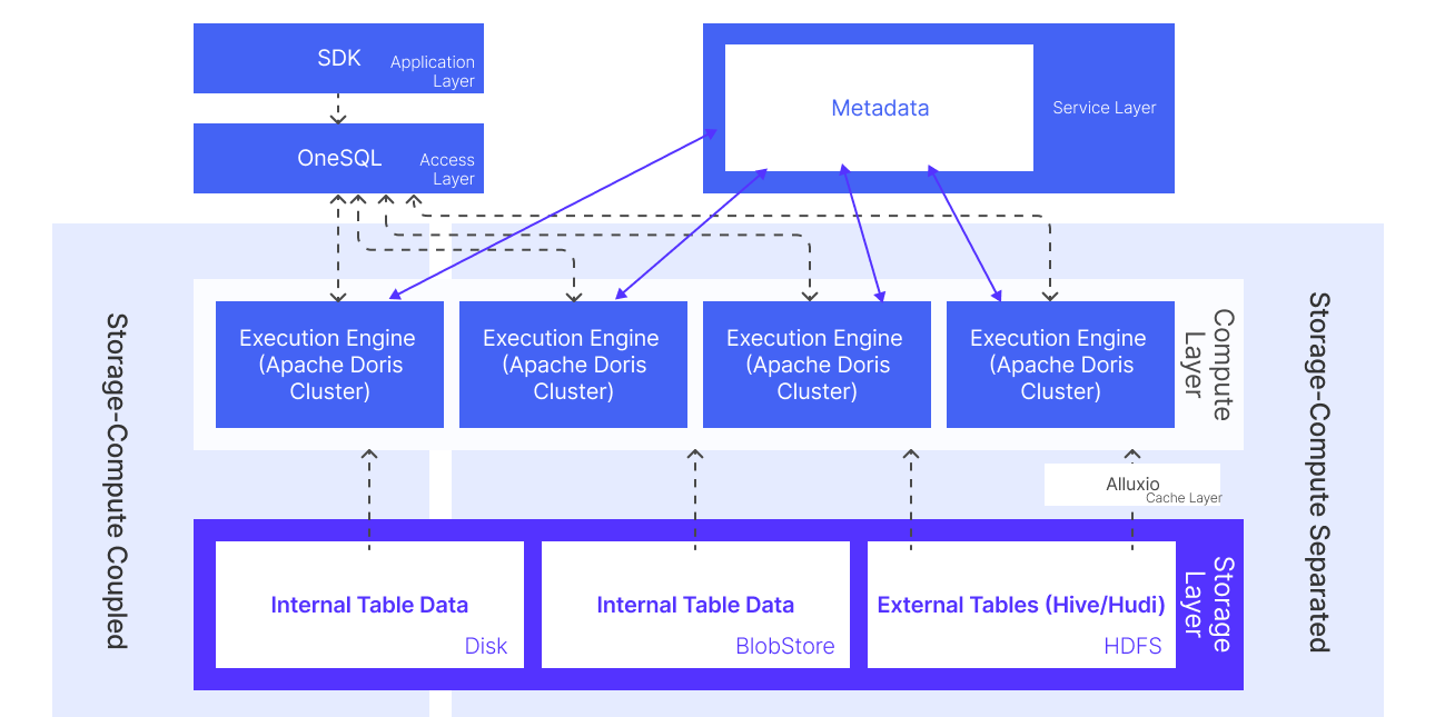 Compute layer: Apache Doris served as the core engine. Different operational teams ran on separate Doris clusters to ensure physical resource isolation, and each team could request additional compute resources on demand. Doris' lakehouse query capabilities allowed it to query both internal tables and external Hive/Hudi data directly, supporting both storage-compute coupled and storage-compute separated deployment modes.