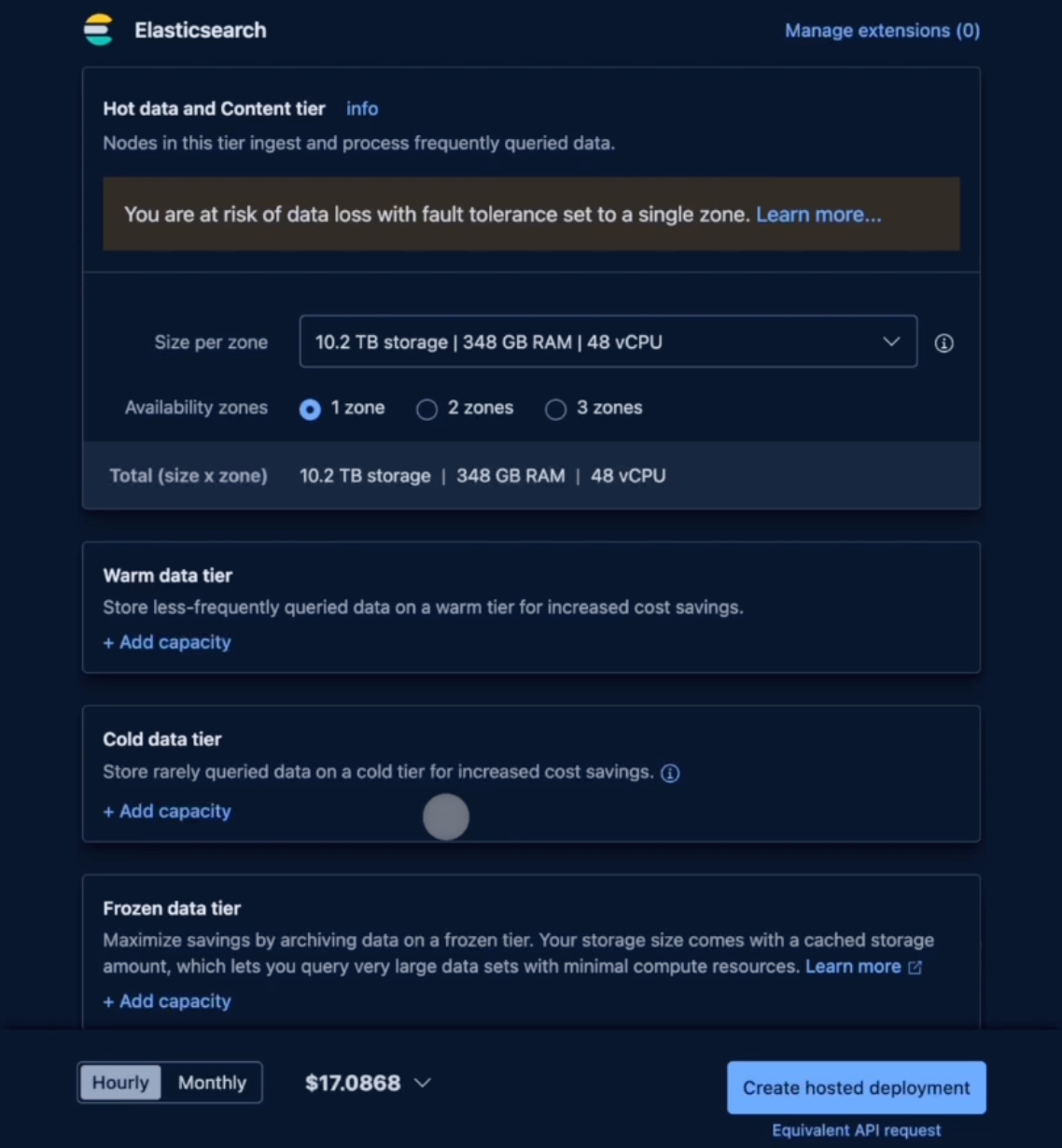 The first step is to purchase clusters with the same configuration (48 vCPU, 348GB RAM) in Elastic Cloud and VeloDB Cloud online products, with costs of 17.0868 dollars/hour and 6.82 dollars/hour, respectively. It should be noted that the storage space configuration in Elastic Cloud is 10.2 TB bound to CPU and RAM, while the storage space in VeloDB Cloud is used on demand.