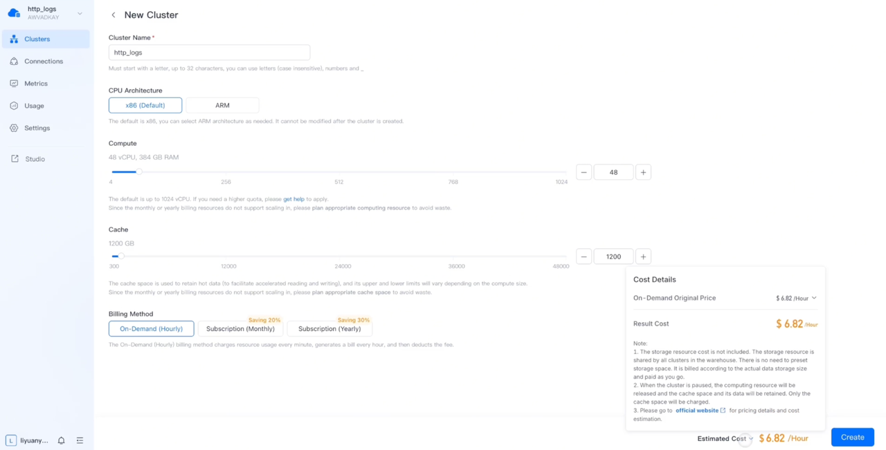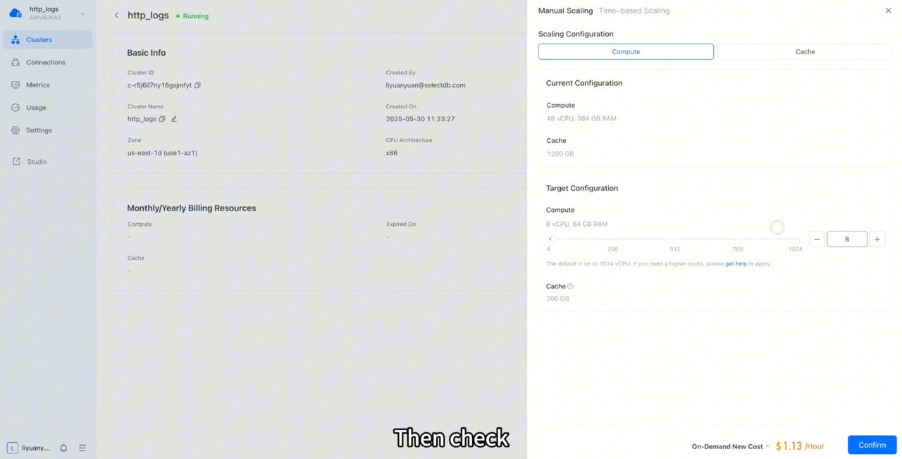 The first step is to reduce the cluster size of VeloDB Cloud 48 vCPU to 8 vCPU, and the cost is also greatly reduced to 1.13 dollars/hour.