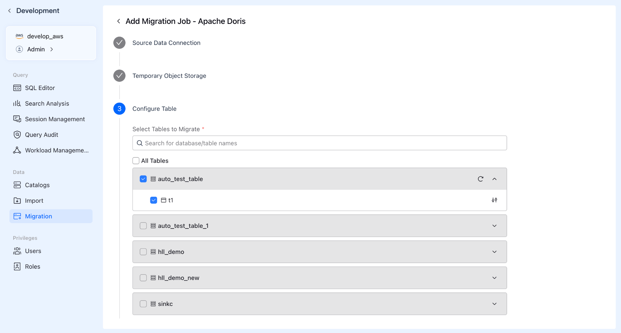 Don't need to migrate the entire database? No problem. The system supports batch selection or custom filtering of databases and tables. Just like shopping in a supermarket, you only pick the core assets you need to move to the cloud.
