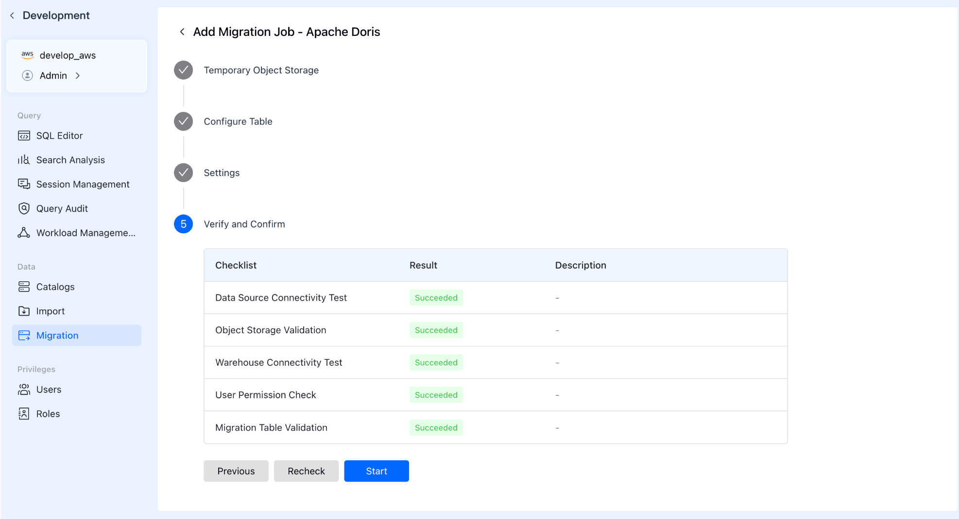 The system automatically runs a pre-check to ensure all configurations are correct. Once passed, click start, and VeloDB Cloud handles the heavy lifting.