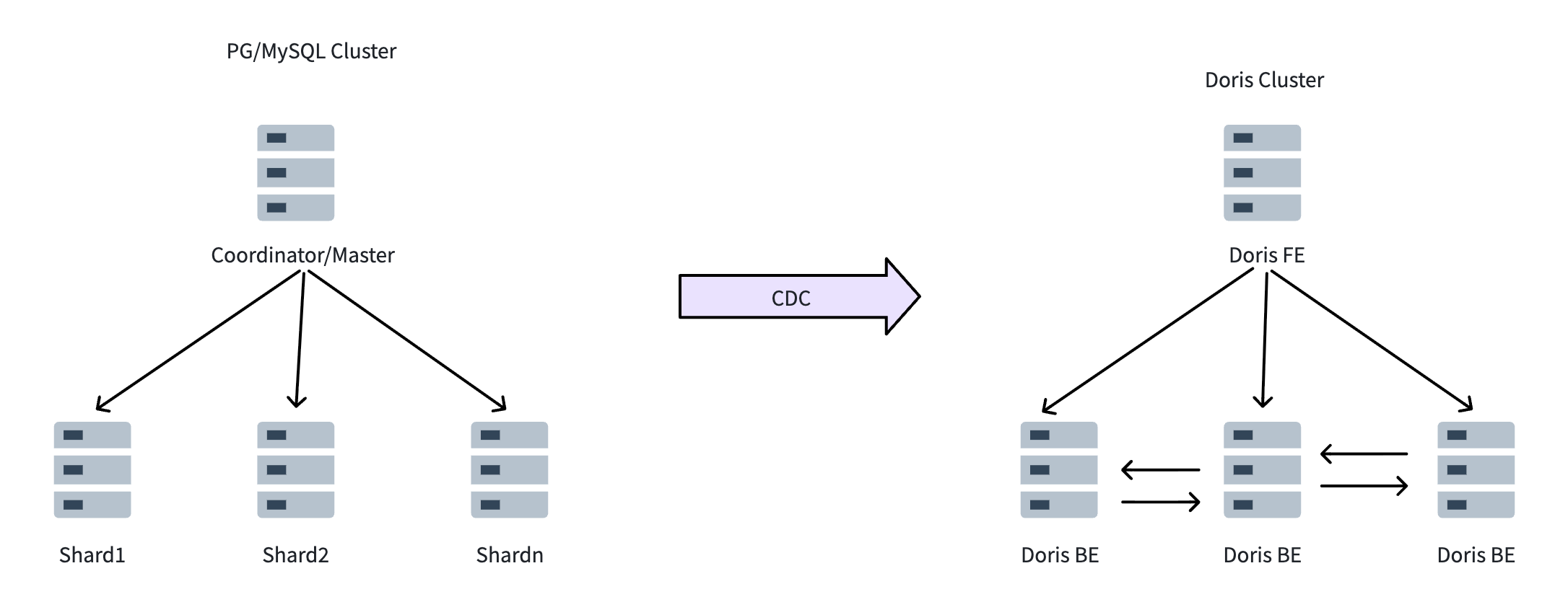 PostgreSQL and MySQL with sharding remain the proven choice for high-concurrency transaction processing. But they were never designed for the real-time analytics demands that modern businesses face. This HTAP architecture, pairing your OLTP system with Apache Doris, separates transactions from analytics at the infrastructure level: each system does what it's best at, without compromising the other.