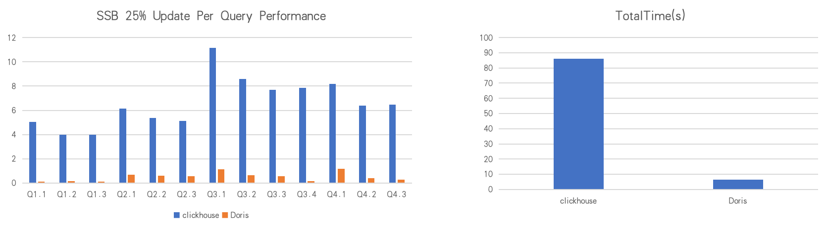 For example, on the Star Schema Benchmark (SSB) SF100 dataset, with 25% of the data under continuous updates, Apache Doris is 25x faster than ClickHouse in overall performance, showing a significant advantage in real-world, update-heavy scenarios.