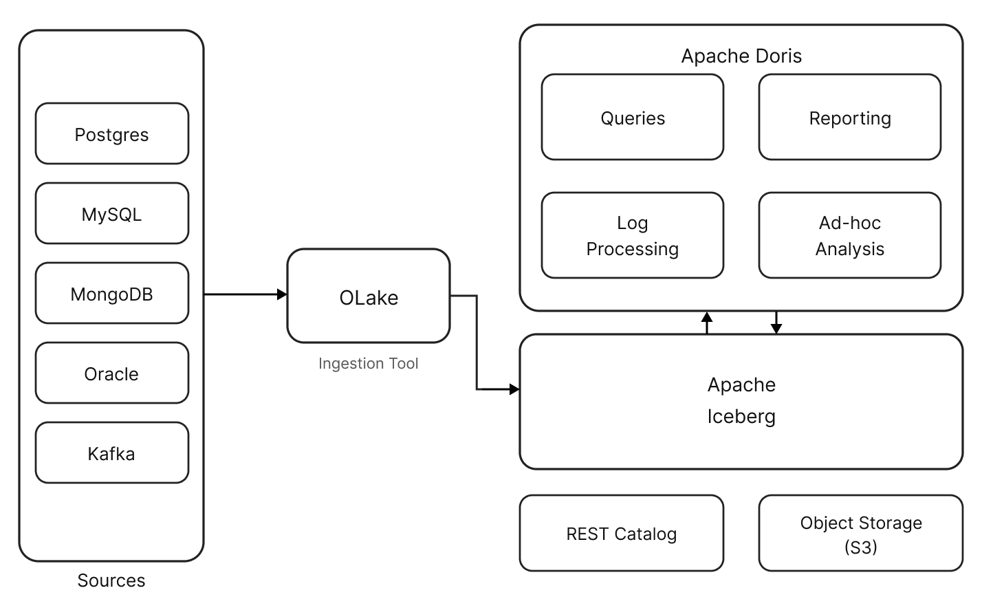 PostgreSQL (Source) → CDC Engine (Ingestion) → Apache Iceberg on Object Storage (Storage) → Apache Doris (Query Engine)