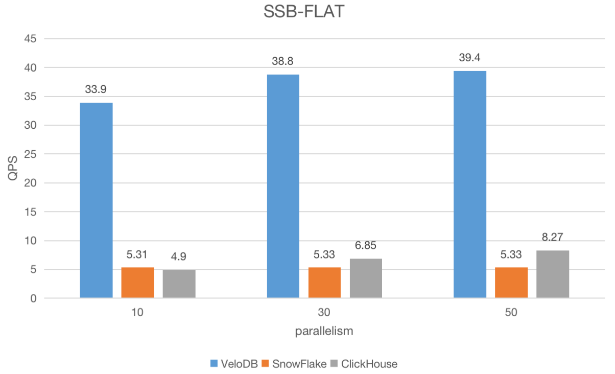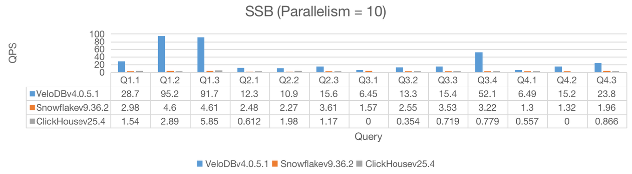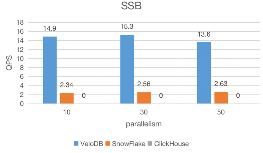 In this benchmark, VeloDB completed all 13 queries and had significantly higher QPS under all three parallelization scenarios, while Clickhouse was unable to complete all the queries.