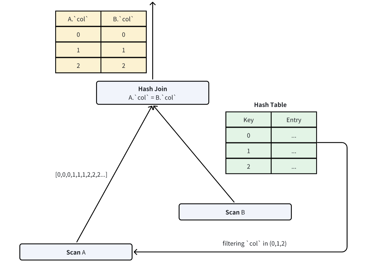 Dynamic Join Pruning (Runtime Filters): For joins, the optimizer builds a Hash Table on the smaller "Build" table first. It then generates filters dynamically to prune the larger "Probe" table. This reduces join complexity from O(M×N) to roughly O(M+N).