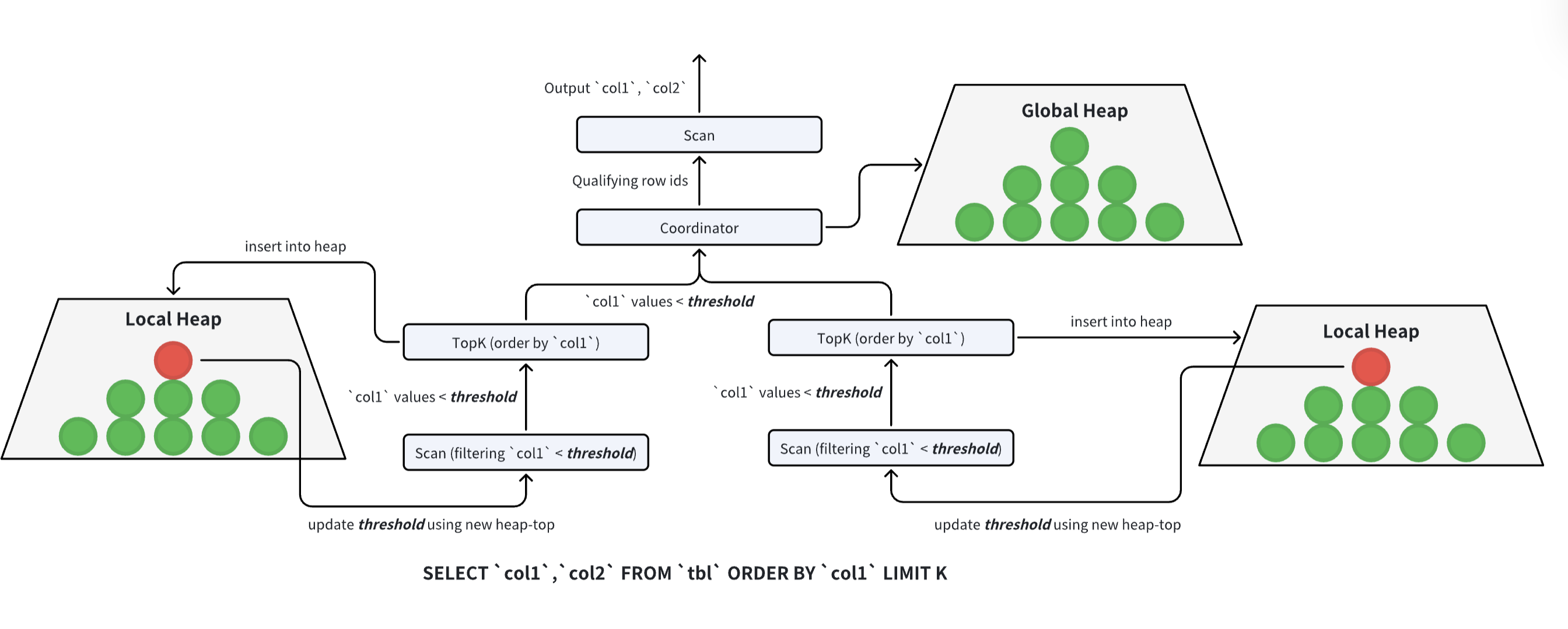 - TopK Pruning: For queries asking for the "Top 10" or "Top 100" results, VeloDB optimizes the sort phase. Instead of fully sorting all data (which is expensive), it uses a heap sort method that aggressively discards data that cannot possibly make it into the top K results during the scan phase.