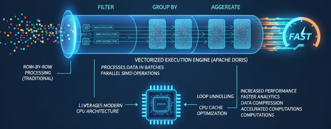 VeloDB processes data in batches (vectors) rather than row-by-row. This leverages modern CPU architectures (SIMD instructions) and cache locality, significantly accelerating operations like data compression and loop computations.