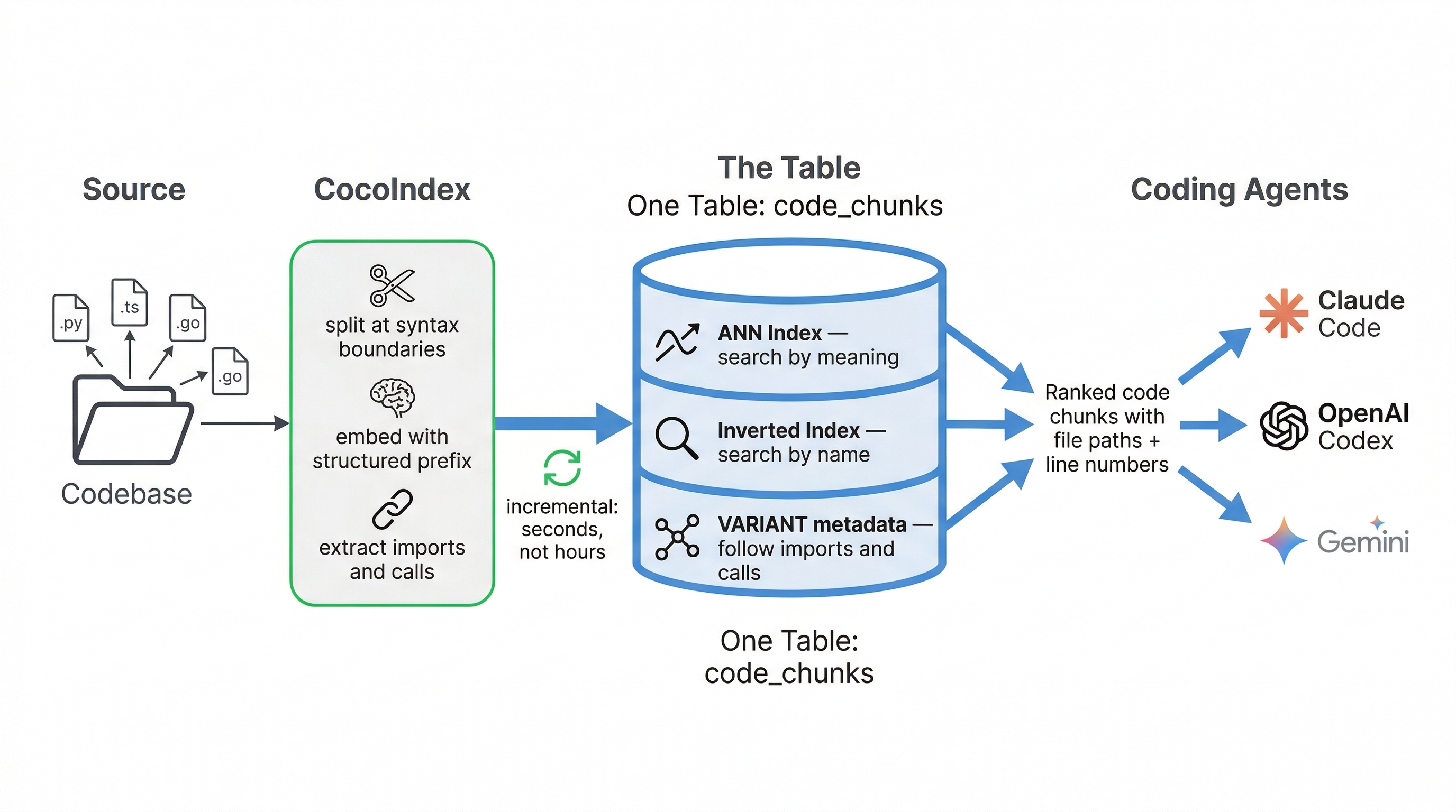 Fixing these three gaps requires four capabilities working together: semantic search to find code by meaning, keyword search to match exact symbols, graph traversal to follow imports and calls across files, and incremental indexing to keep pace with every commit. The conventional approach is to bolt together a vector database, a search engine, and a graph database. CocoIndex + VeloDB take a different path: one table, three indexes.