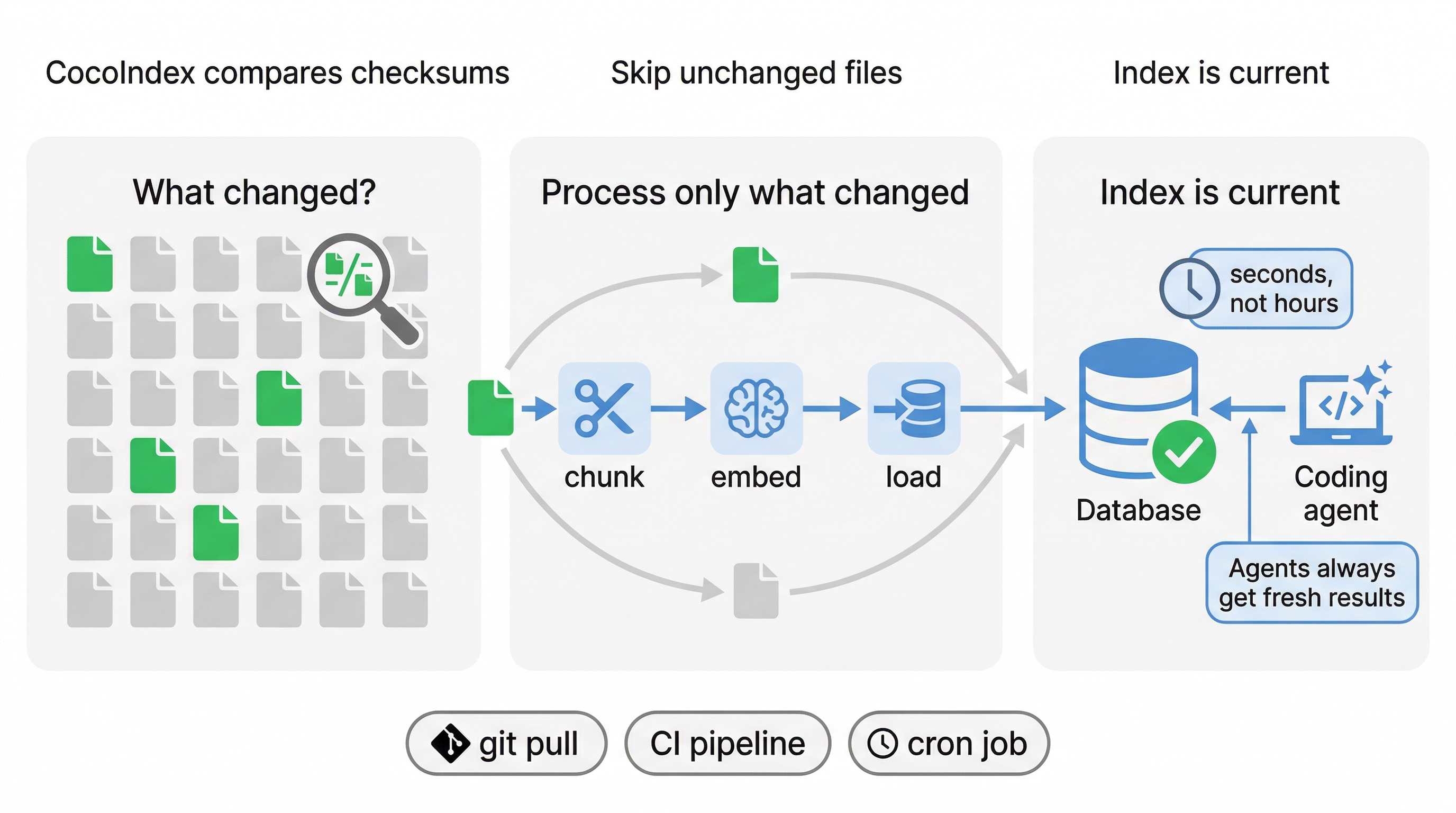Incremental freshness: Change one file out of five thousand. Six seconds later, the index knows.