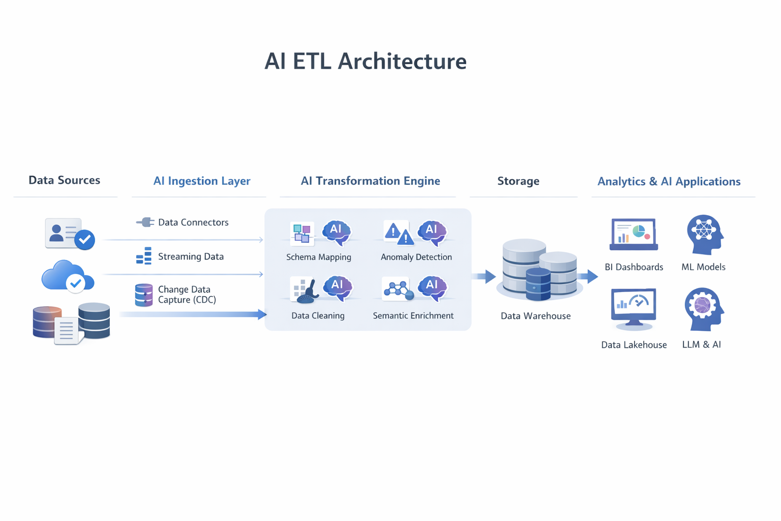 Instead of relying entirely on static rules and manual configurations, AI-powered ETL architectures incorporate intelligent systems that can analyze metadata, detect schema drift, and optimize pipelines dynamically.