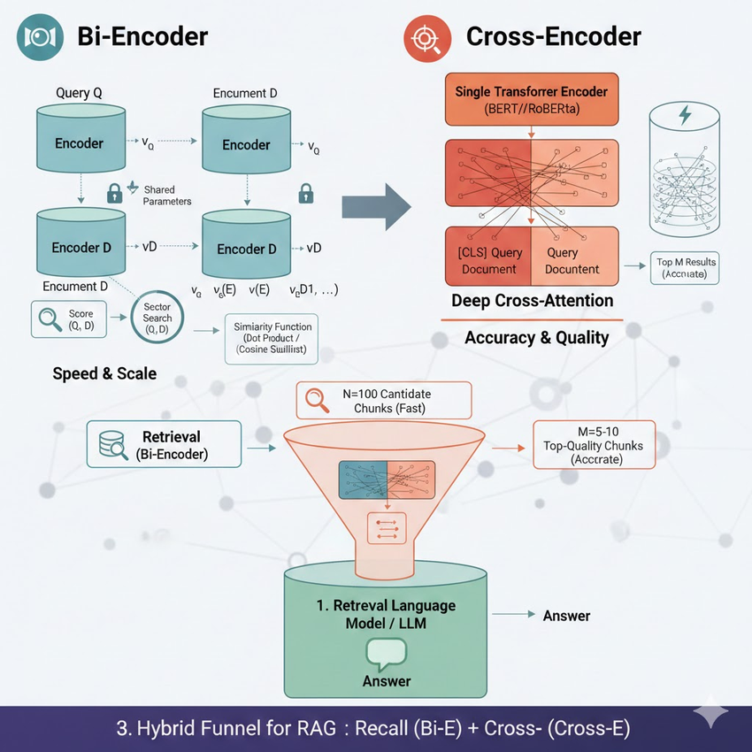 Image: RAG Funnel Diagram: Bi-Encoder for Stage 1, Cross-Encoder for Stage 2 (Reranking), leading to the LLM for Generation.