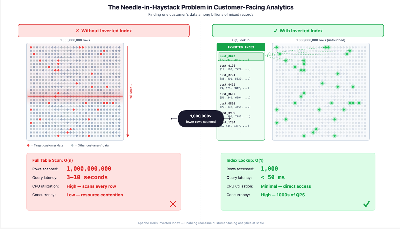 - Efficient needle-in-haystack queries. Built-in inverted indexes on any column enable efficient filtering across multiple dimensions. Queries like "all orders for customer X with status Y in date range Z" execute in milliseconds regardless of total data volume.