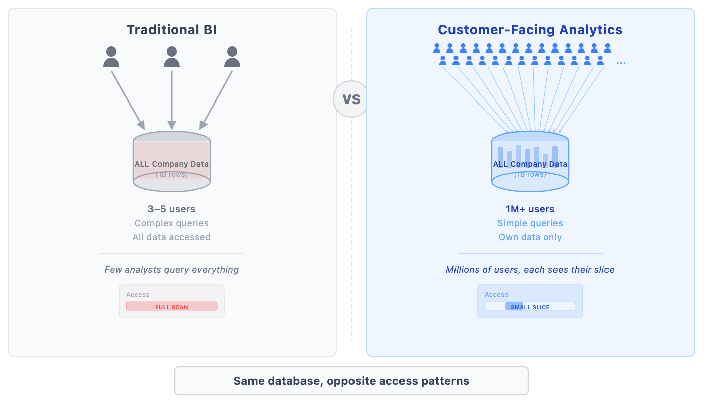 This inversion creates fundamentally different technical requirements. BI tools optimize for complex analytical queries run by dozens of analysts. Customer-facing analytics must optimize for simpler queries run by millions of users simultaneously.