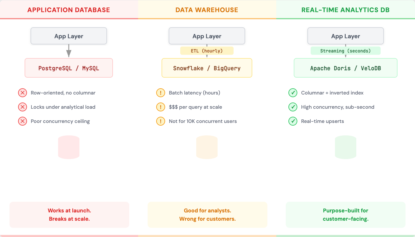 Data warehouses struggle with customer-facing requirements. They're not designed for thousands of concurrent queries. They don't optimize for sub-second latency on simple queries. They assume data freshness measured in hours, not seconds.