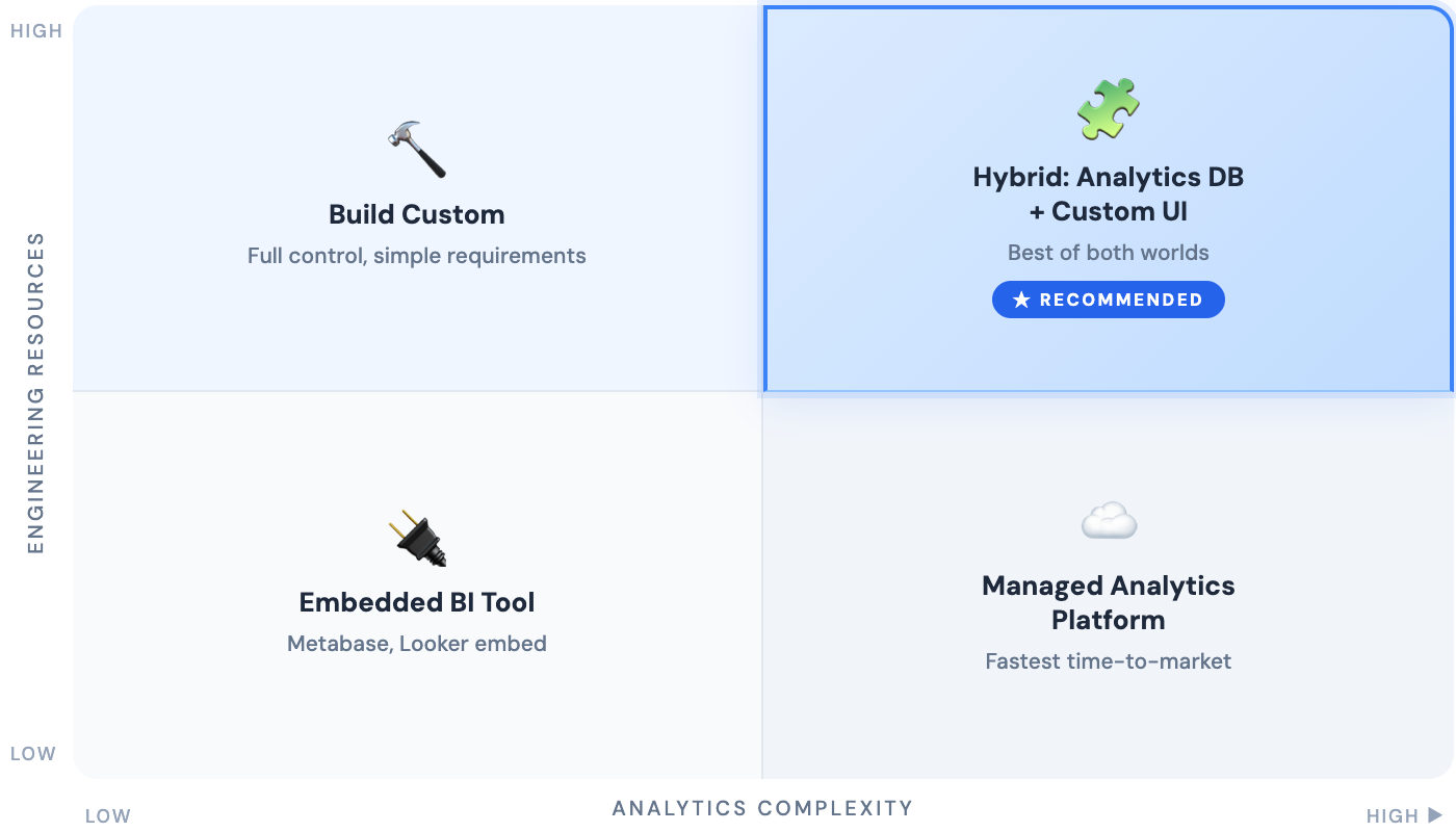 Many successful implementations combine approaches. A purpose-built analytics database handles the data layer, providing the performance characteristics required for customer-facing workloads. Custom application code builds the visualization and interaction layer, providing complete control over user experience.
