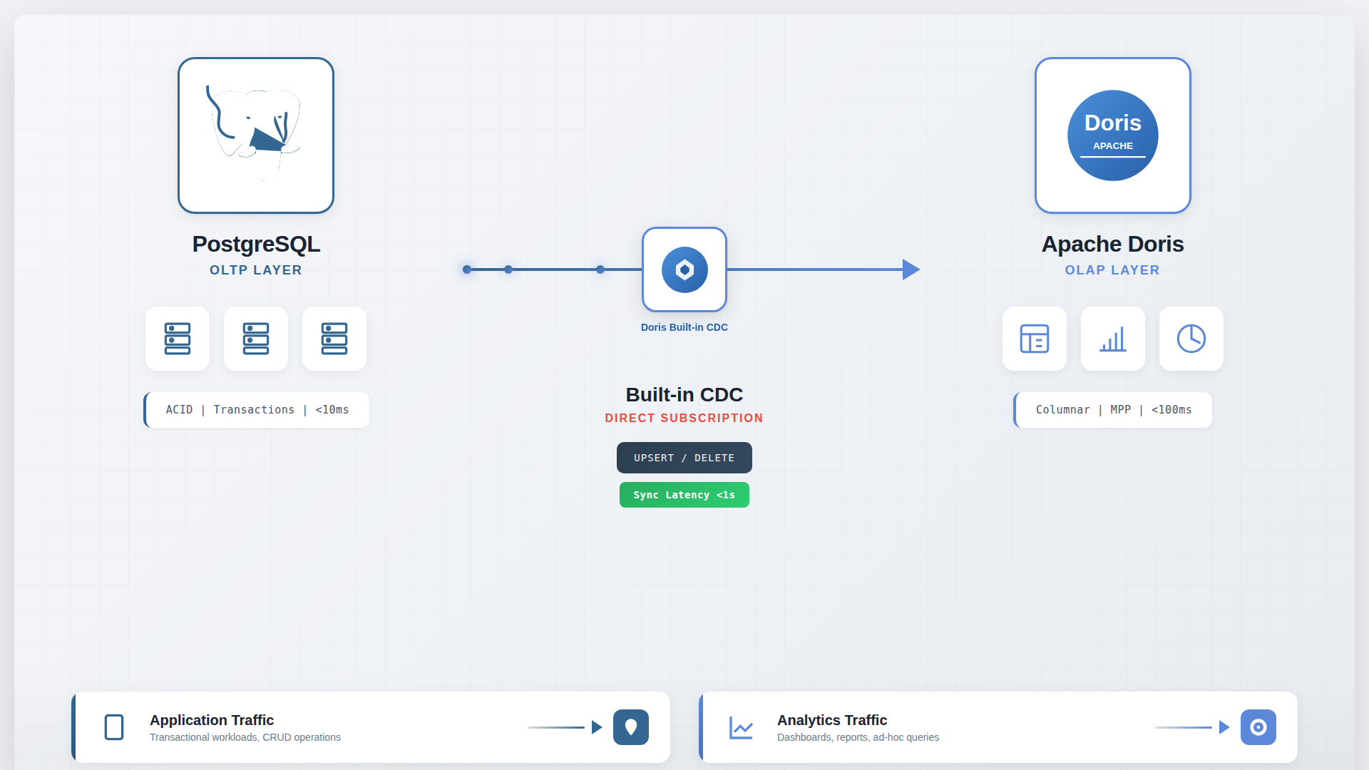 PostgreSQL stays the source of truth. Doris receives synchronized data for analytics. Each system does what it was designed for.