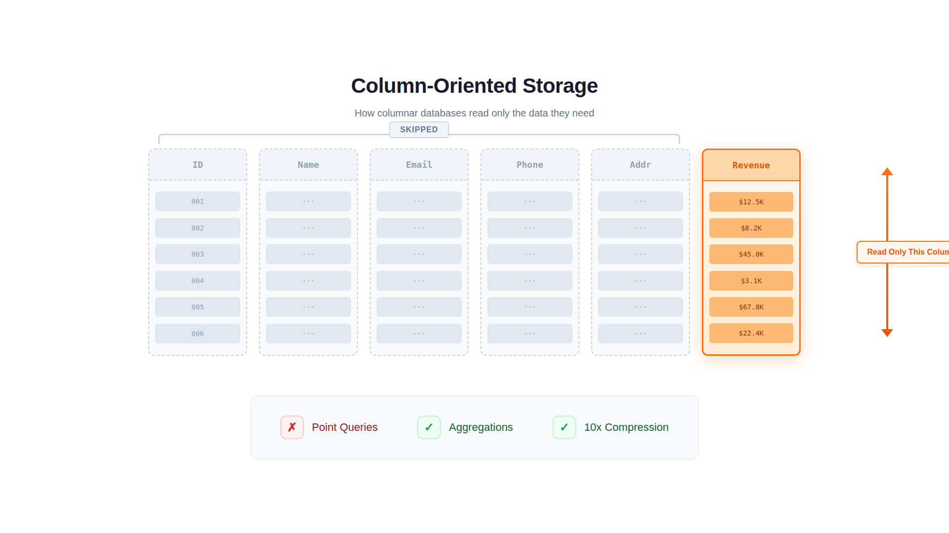 Columnar storage. Data is stored column by column, not row by row. A query asking for SUM(revenue) reads only the revenue column—not customer names, addresses, or order notes. This alone can reduce I/O by 10-50x.
