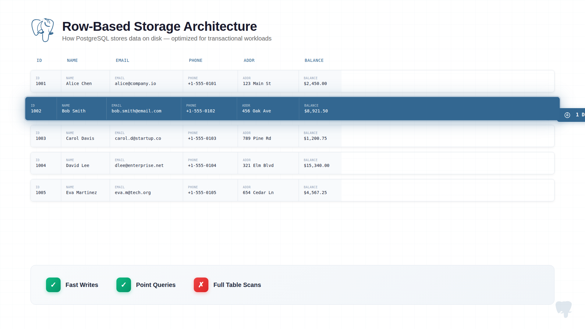 Row-based storage. Data is stored record by record. When you fetch a customer, you get all their fields in one disk read. This is fast for operations that touch complete records.