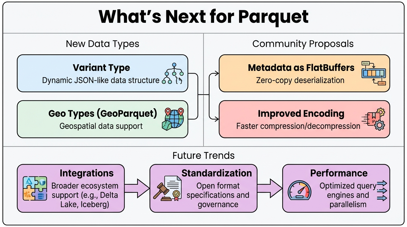 The Parquet community continues to evolve the format, introducing new data types and exploring architectural improvements to meet emerging data processing needs.