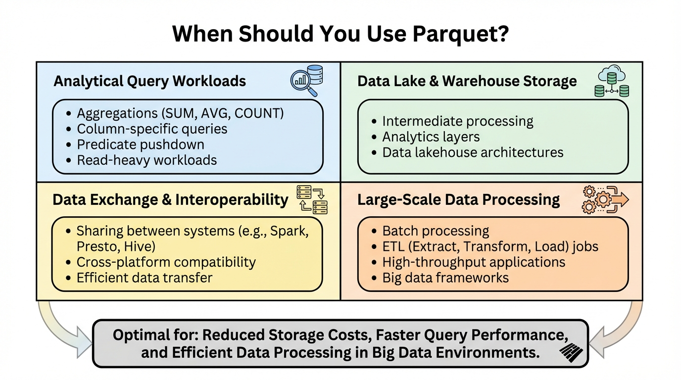 Parquet excels in specific scenarios. Understanding when to use it helps you make informed architectural decisions.