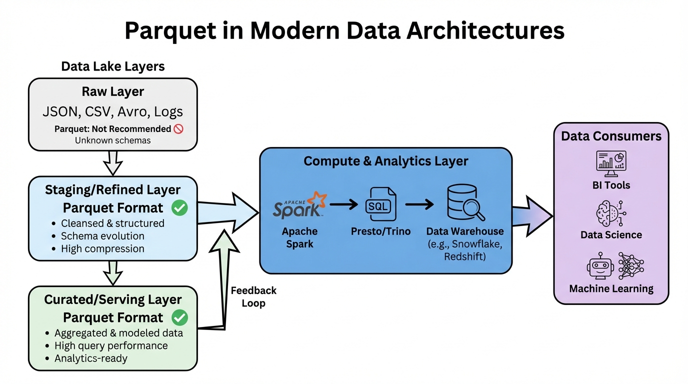 Looking forward, Parquet continues to evolve with new features like Variant types for semi-structured data and GeoParquet for geospatial analytics. Combined with table formats like Apache Iceberg and Delta Lake, Parquet provides a solid foundation for modern data lakehouse architectures.