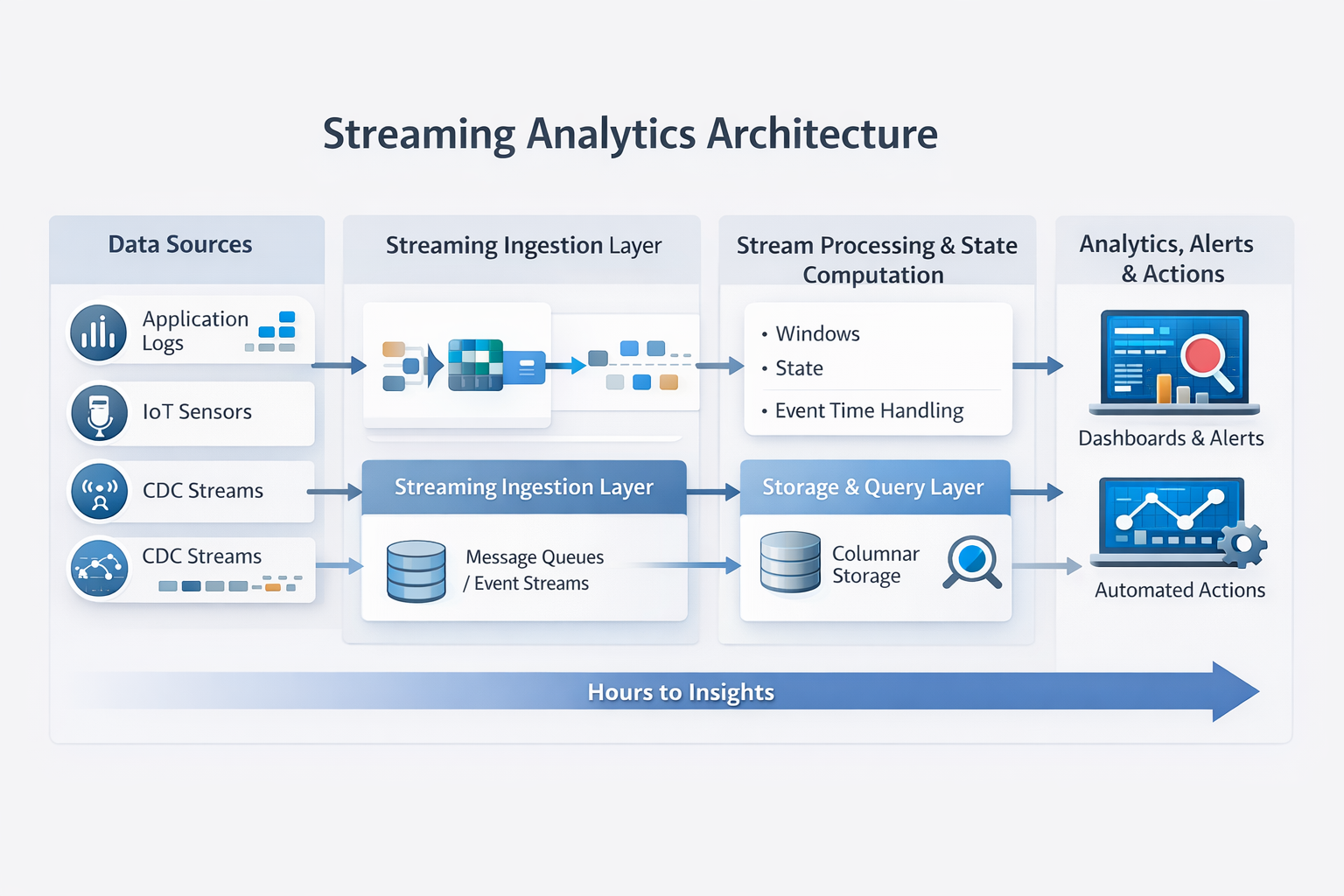 At a high level, a production streaming analytics architecture consists of four tightly coupled layers.