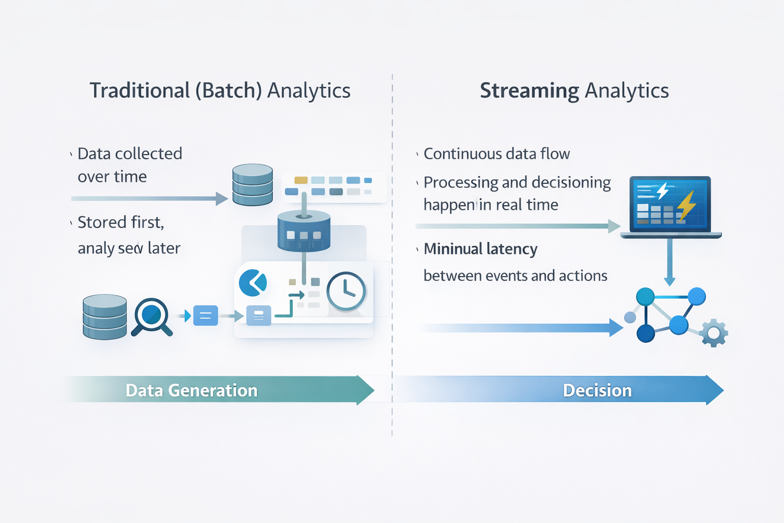 Traditional analytics is built around the idea that data can be collected, stored, and analyzed later. This works well for historical reporting, trend analysis, and offline optimization. Latency exists, but it is acceptable because decisions are not time-critical.