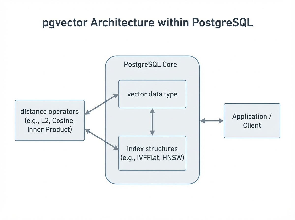 pgvector integrates vector operations directly into PostgreSQL by introducing a new vector data type and specialized operators for similarity calculations. This design lets you combine vector search with traditional SQL queries in a single database system.